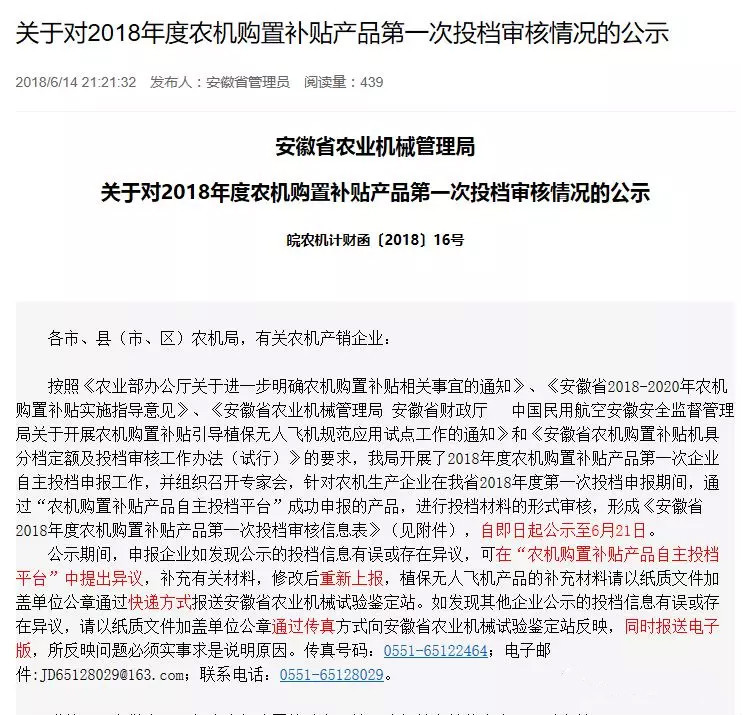 2018年6月14日公布安徽省农业机械管理局发布了2018年度农机购置补贴产品审核情况: