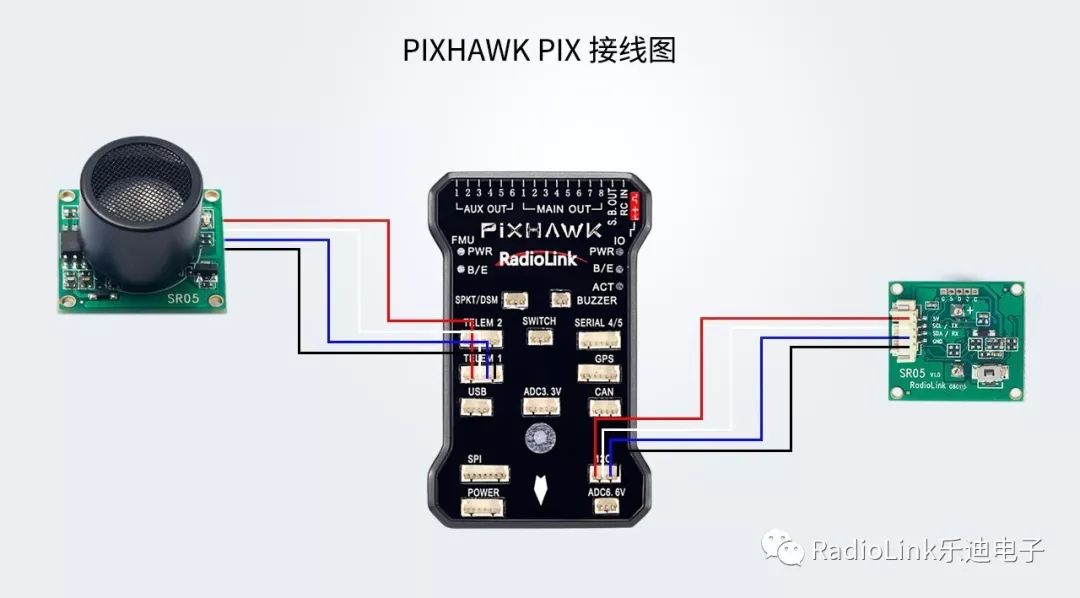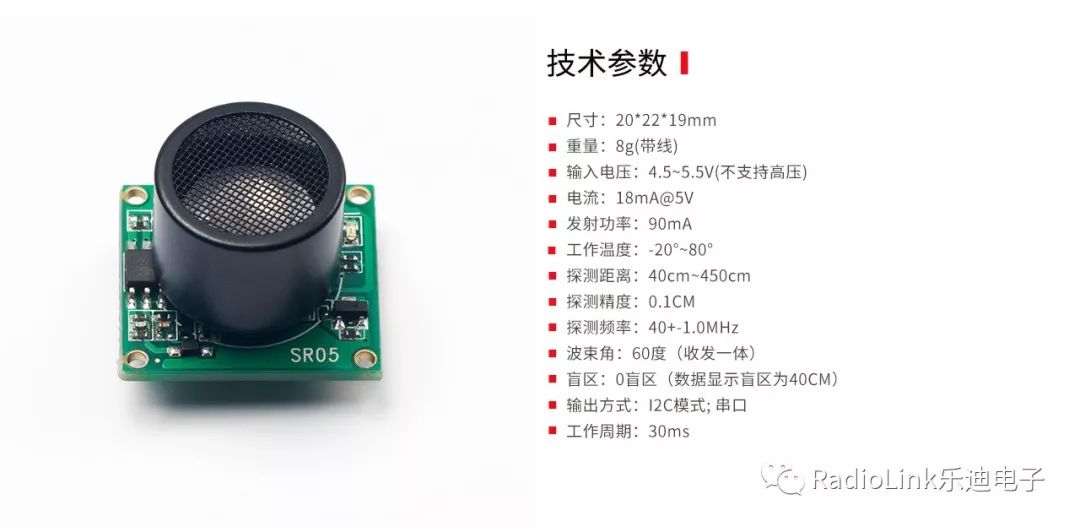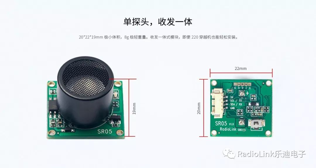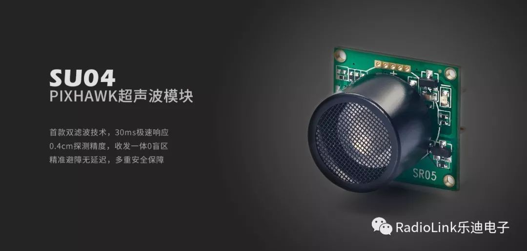乐迪PIXHAWK超声波壁障/定高模块SU04,适用PIXHAWK飞控,自动自动识别飞控的I2C,UART,MAVLINK接口协议,无需外接其他设备。用于地面定高,上方和平面避障。