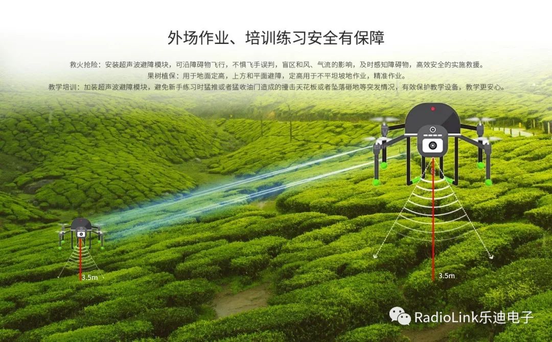 果树植保:用于地面定高,上方和平面避障,定高用于不平坦坡地作业,精准作业。