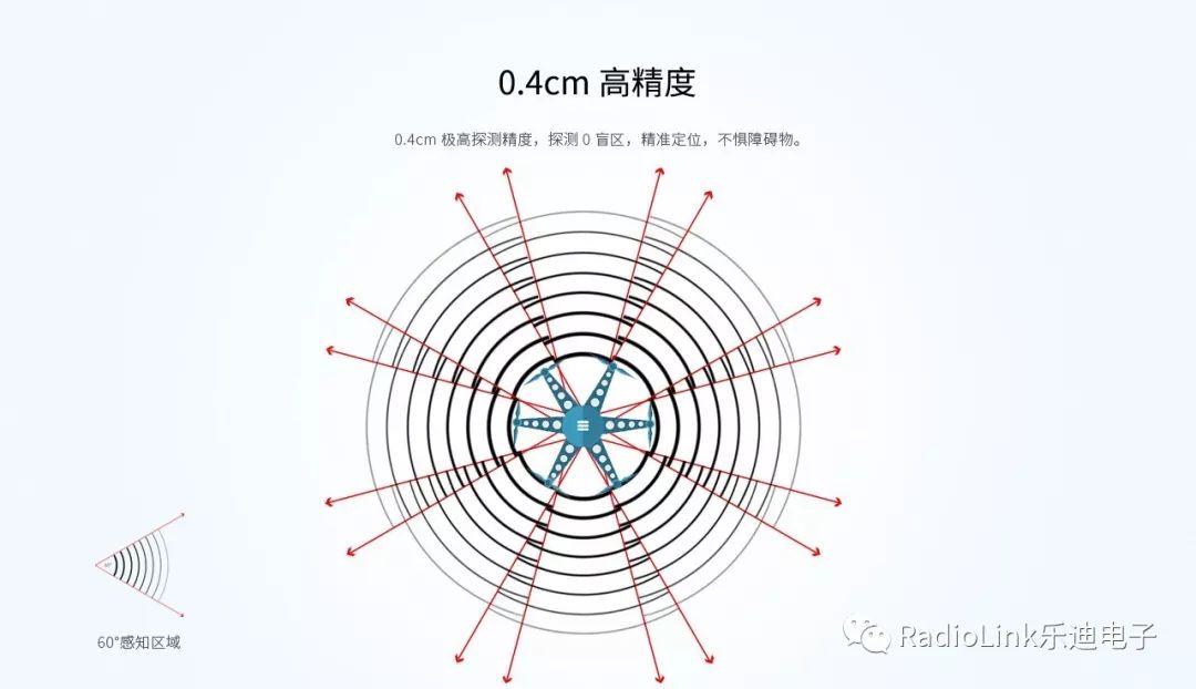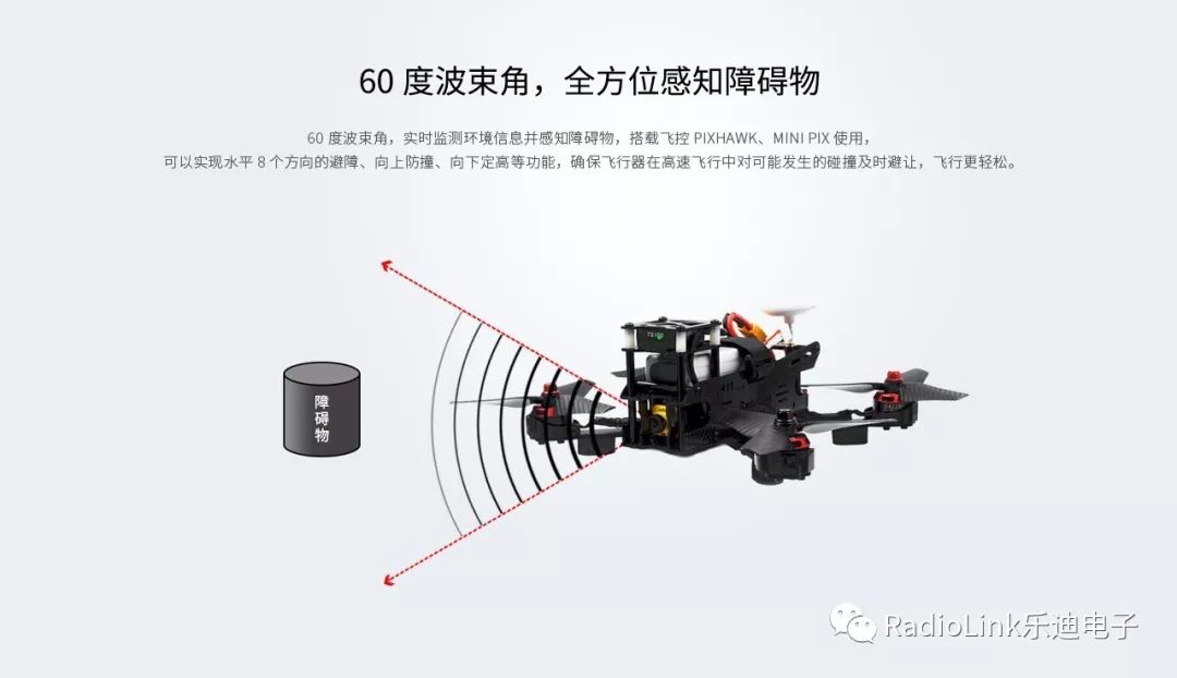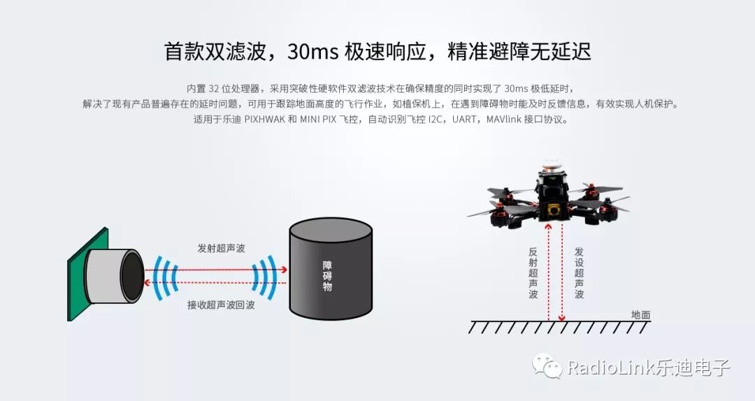 内置32位处理器,采用突破性硬软件双滤波技术在确保精度的同时实现了30ms极低延时,解决了现有产品普遍存在的延时问题,可用于跟踪地面高度的飞行作业,如植保机上。