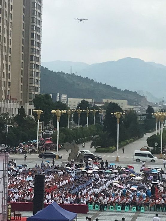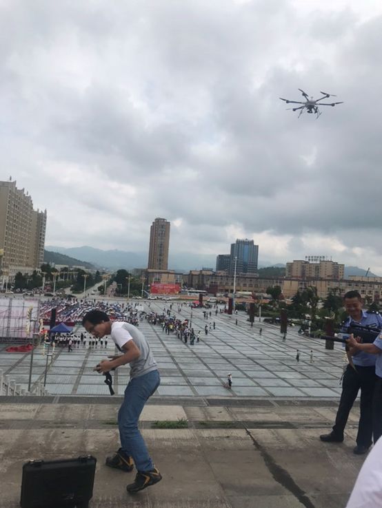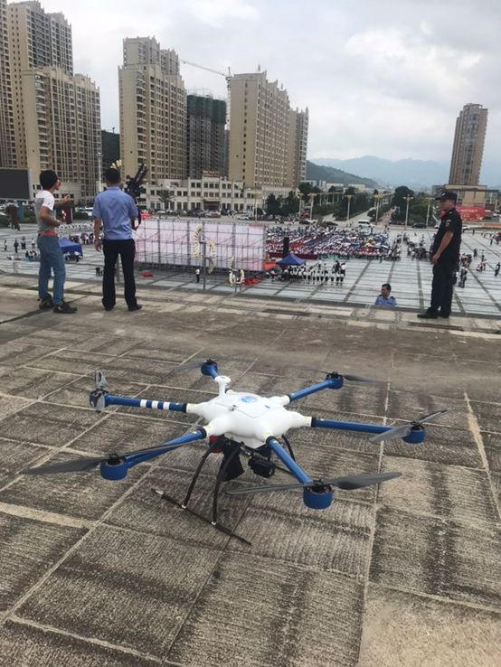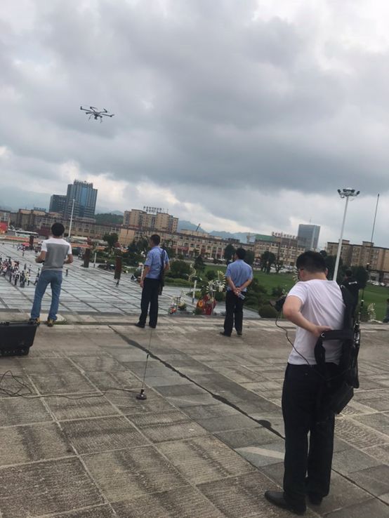 慧明捷受独山县公安局的邀请,协助保障现场的安全秩序。工作人员通过搭载无人机上的喊话云台系统,进行空中喊话,指引民众有序入座,切勿拥挤抢位,注意安全。同时,利用无人机和单兵系统空地联动相融合的方案,把现场采集的画面实时高清的传输回到县政府指挥中心的大屏,方便安保预备小组根据现场活动进行状况做好应急措施。