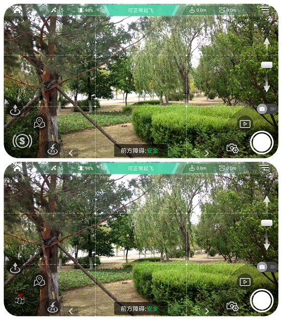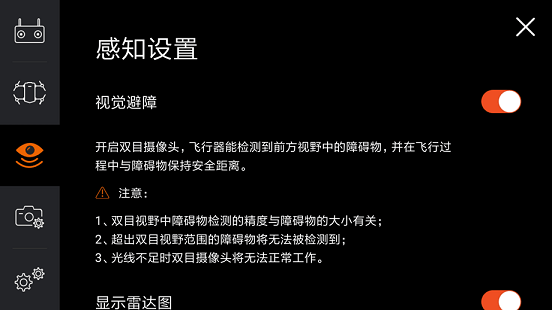感知设置应对的主要是视觉避障功能,这项功能是非常重要的,每次进入飞行界面时,系统也会有明显的提示,提醒你开启视觉避障功能。开启次功能后,无人机会变得非常聪明,对于前方出现的障碍会自动的躲开或者刹车,这项功能对于自动返航时十分重要,避免无人机在返航的时候遭遇障碍,以保障无人机能够安全返回起飞点。