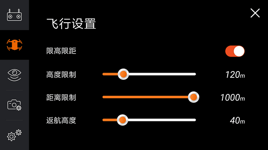 飞行设置是十分重要的功能,能够限制无人机最大的飞行高度、距离和返航高度,系统以120米的高度为默认值,在超过默认值会自动弹出限高声明,以免触犯相关法律,而在这个界面中也可以看到无人机最高可以飞行500米,而最远可以达到1000米,是除了大疆之外,为数不多可以飞出眼睛可视范围的无人机。
