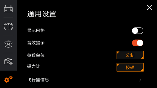 通用设置主要可以调节画面的网格显示、音效提示、更改参数单位,最重要的是磁力计功能,在必要的时候可以对无人机进行磁力校准。