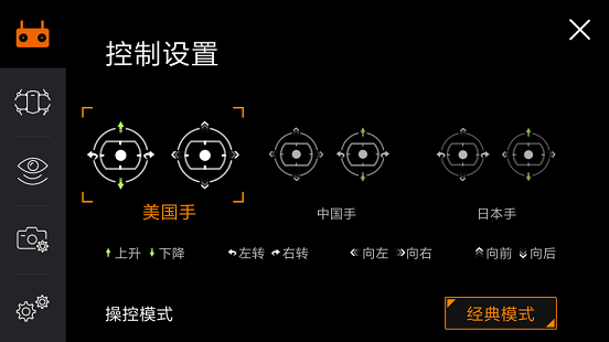 控制设置主要是用来改变操纵杆模式和自定义快捷键,美国手、中国手和日本手的之间的区别在于操纵杆功能的不同,并以美国手为默认,左侧操纵杆控制上升下降和左转右转,右侧操纵杆控制前后左右,并能自定义手柄背部的C1和C2按钮的功能。