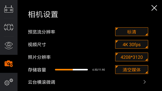 相机的设置简单明了,可以根据自己的要求,来更改视频录制的参数,GDU O2最高可以录制每秒30帧的4K视频,照片最大分辨率可达到4208*3120,但16G的存储系统转换之后还剩11.9G,感觉还是有些不够,但考虑到无人机20分钟的续航时间,12G完全可以持续到录制结束。