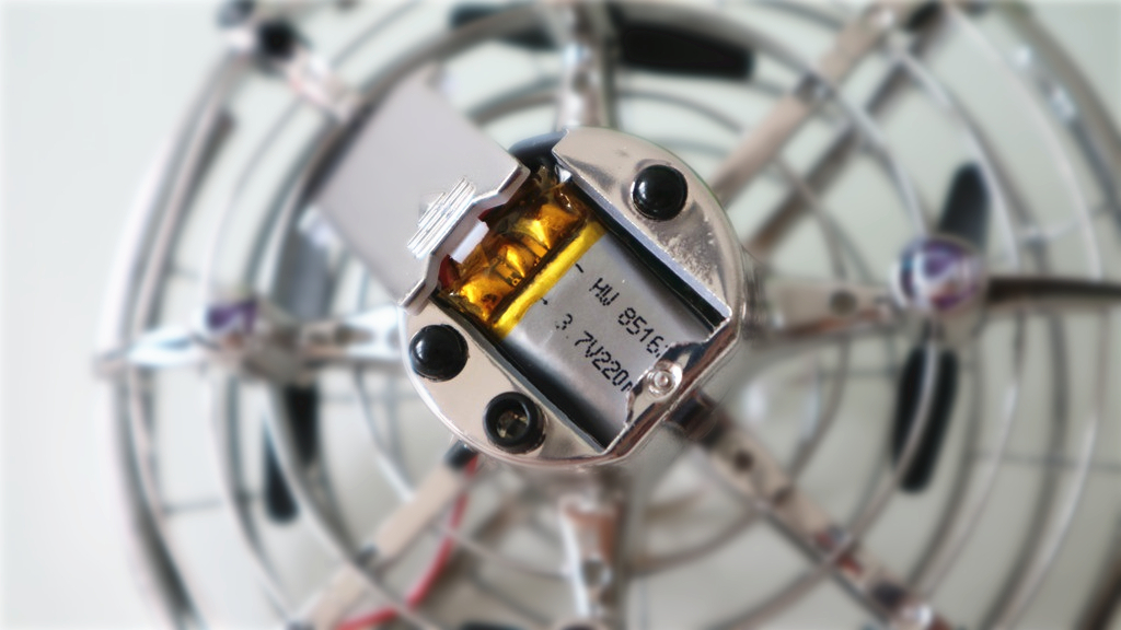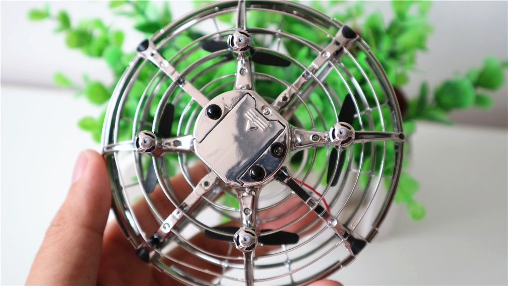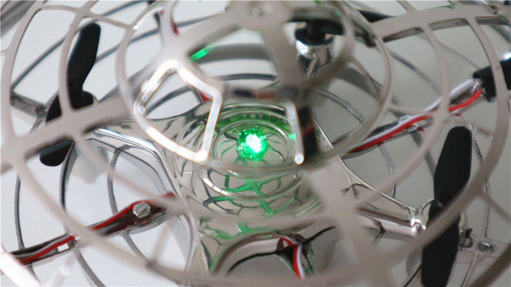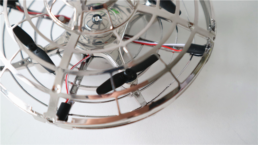 机身内部共有4个空心杯电机,黑色浆叶,机身侧面有四个红外感应灯,以及顶部和底部也配有红外感应灯,因此可以做到人体感应飞行。