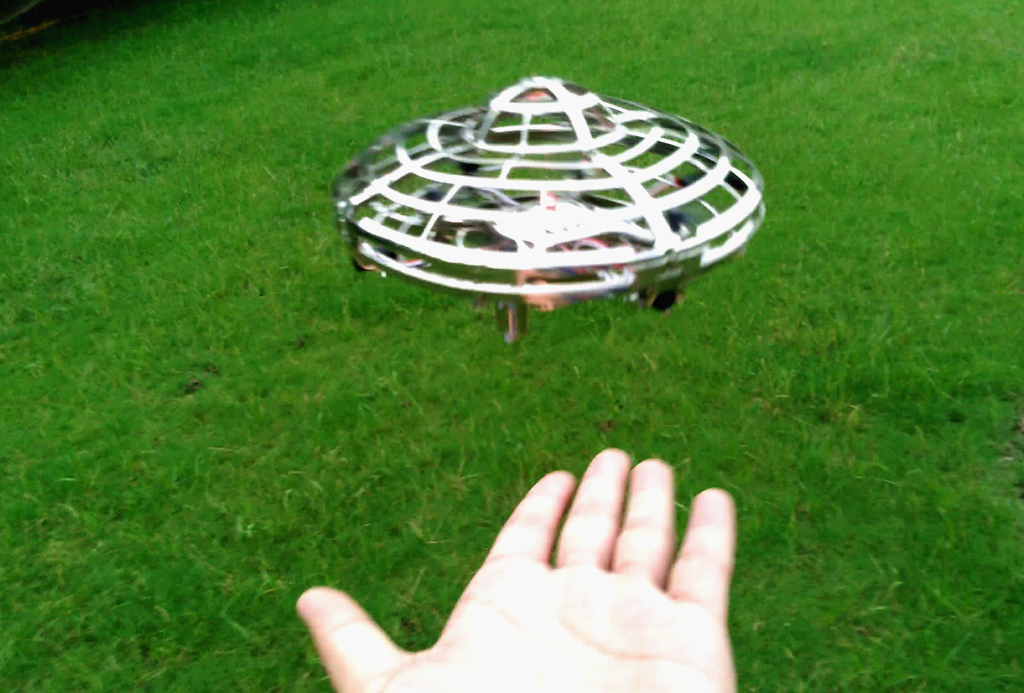 而推高的时候同样受浆叶的转速有关,当小孩子用手想去拖住它的时候,飞行器下方的红外感应灯检测到会里面拉高,从而不落地。