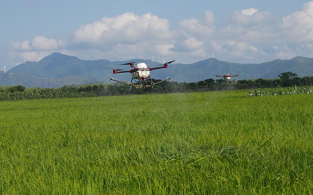 一架小型无人机可负载10公斤农药,在低空喷洒农药,一分钟可喷洒一亩地,充电一次可喷洒10-20亩地,喷洒效率是传统人工的 30倍以上。同时它具有作业高度低,飘移少,抗风六级,可空中悬停,旋翼产生的向下气流有助于增加雾流对作物的穿透性,防治效果高于地面植保机械,农林植保无人机采用智能操控,无需专用起降机场,中远距离遥控操作,提高劳动者喷洒作业人身安全性等诸多优点。同时,该类无人机简单易学,大大降低了农民学习和使用的门槛,完全可以向普通农机一样普及管理与推广使用。