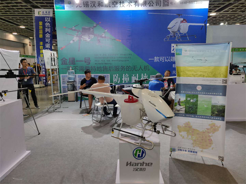 无锡汉和航空技术有限公司是一家老牌做无人直升机的研发、生产和应用,是中国第一家农药喷洒无人机企业。此次展会,汉和携金星一号电动多旋翼植保无人机、水星一号电动单旋翼植保无人机亮相。金星一号作为公司一款明星产品受到广大用户的青睐,该产品采用无关节设计,主梁用航空铝,耐磨损,耐变形,具防撞耐摔专利技术。遇外力撞击后,电池、药箱、机架主动分离,每个模块单独承受外力冲击,不会对电机、电调、飞控造成二次伤害,极大程度上降低维修成本,提高使用寿命。