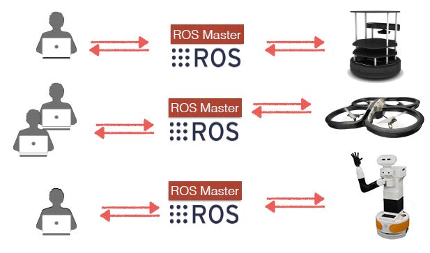 (b) 中心方法:所有的机器人和用户都连接到了一个中心ROS主控器。