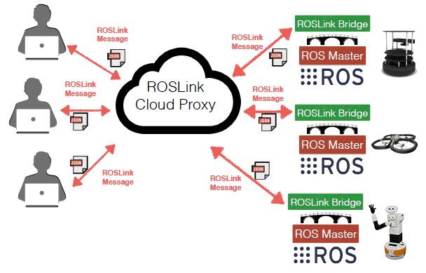 为了克服这些局限性,我们提出采用三层客户机/服务器模型的ROSLink,其中客户端在机器人和用户中实现,而服务器位于公共领域并充当代理将机器人与其用户相连。 ROSLink克服了上述的两个问题。首先,机器人内部不再设服务器,因此不再采用以机器人为中心的方法。相比之下,机器人通过ROSLink Bridge组件实现客户端,ROSLink Bridge组件是一个ROS节点,一方面与ROS进行交互,另一方面通过网络接口(UDP,TCP, 或Websockets)向外部发送ROS数据。此外,该模型的ROSLink服务器端在一个名为ROSLink 代理的公共服务器中实现,该服务器充当机器人和用户之间的中介。机器人和用户向代理服务器发送消息,代理服务器相应地将其发送给另一端。