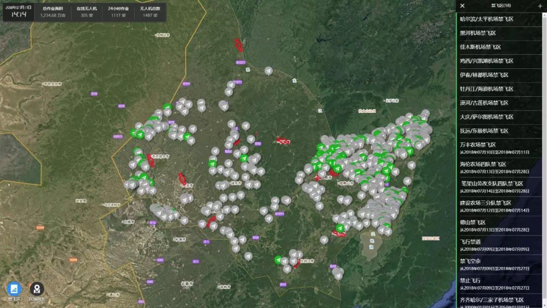 因此,北大荒集团联合极飞科技发布了“数字龙江-航空植保平台”,通过统一平台对区域内的无人机和有人机进行管理,杜绝黑飞和其它安全隐患,保证航化作业安全。