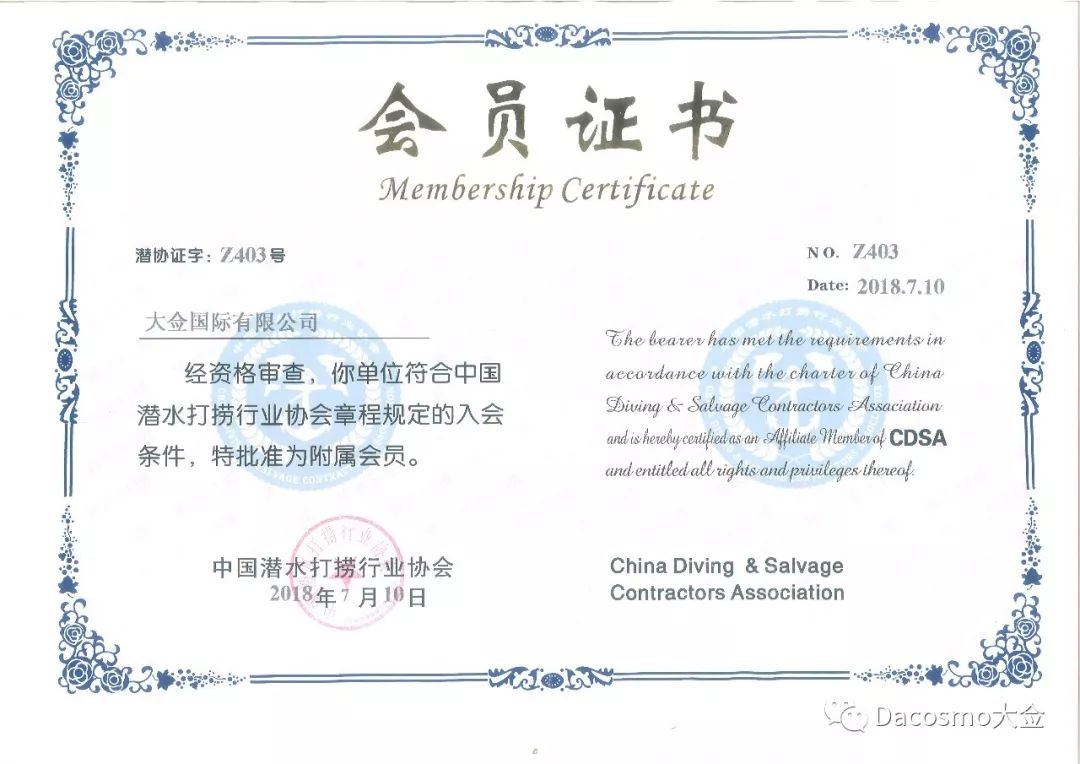 因为大佥在水下机器人工作各方面的努力,我们还有幸获得中国潜水打捞行业协会的肯定和批准,成为协会正式会员。大佥将不仅希望通过VideoRay ROV水下机器人技术协助大家实现资产管理,更希望能够为保护人民的生命安全尽一份力。