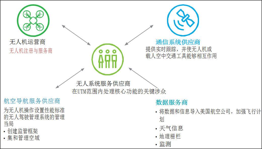 图1所示:无人飞行器交通管理系统(UTM)生态系统的关键利益相关者