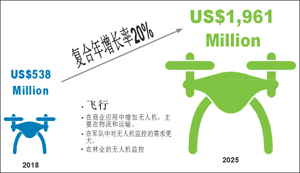 无人机已被证明是商业和非商业运营商等众多应用的重要工具。过去,无人机仅限于军事防御应用。然而,在过去的十年里,技术有了显著的进步,而且随着规模的缩小,它们的数量和能力也随之增加。今天,无人机已经成为商业应用的一种经济解决方案,如测绘、航空摄影等。“无人机即服务”(drone-as-a-service)的重要性日益上升,以及由政府提供的优惠政策