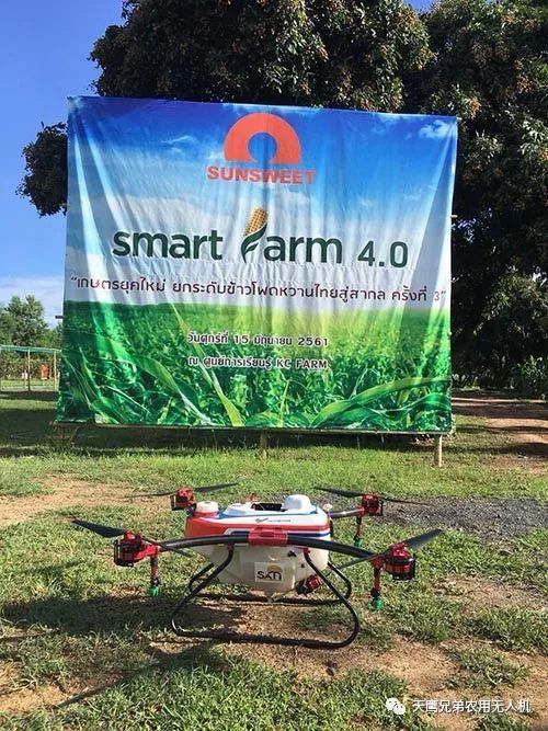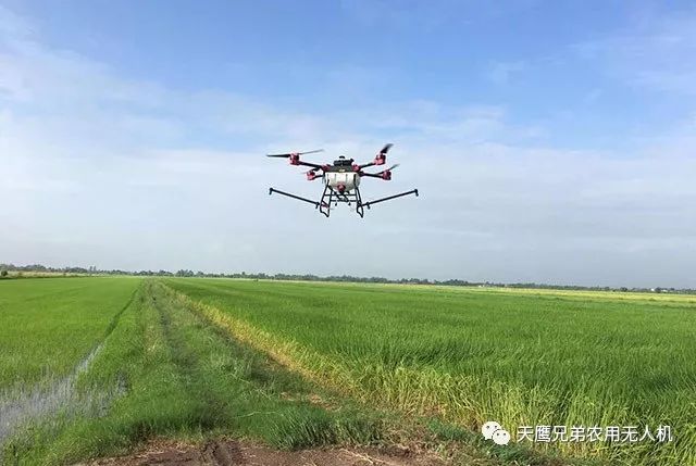 这是泰国专业植保服务队正在利用天鹰兄弟植保无人机对田地喷洒农药,每天可喷洒400亩,相当于30个人工。