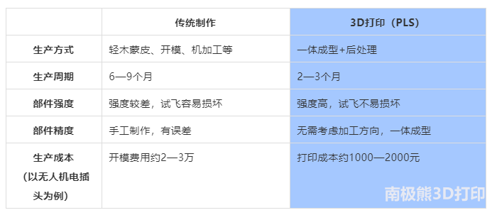 与传统工艺及其他3D打印技术相比起来,华曙高科PLS解决方案具有不可替代的优势,其成型件对环境(温度、湿度和化学腐蚀)的抵抗能力类似于热塑性材料,具有良好的强度和优异的抗冲击性能,适合小批量生产部分无人机结构件。