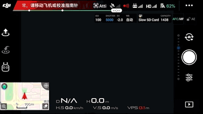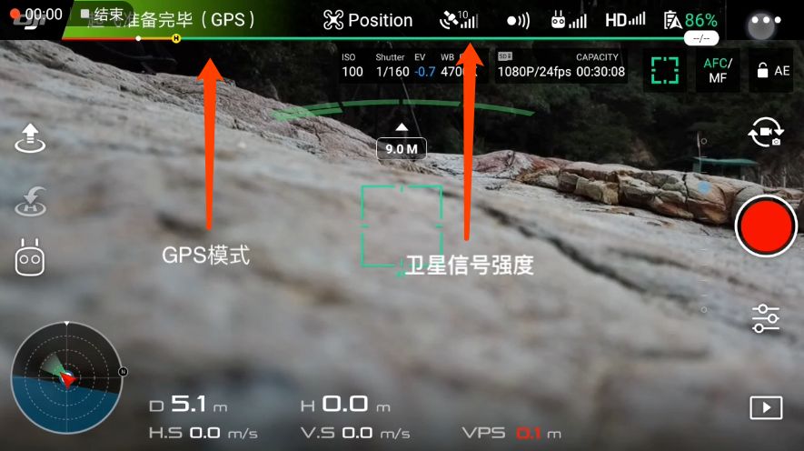 检查 GPS 情况,保证足够的卫星信号(至少 6 颗卫星以上)强度,且必须在 GPS 模式下,待无人机刷新返航点后起飞。