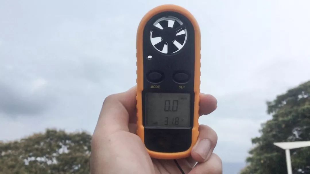 可以看到这位飞手手中的风速计没有任何指数,这样的地面风力环境最适合无人机起飞。对风速的判断和预测,也可结合 DJI GO 4 界面的姿态球和天气 App (查看过往天气 App 选择教程)来实现。
