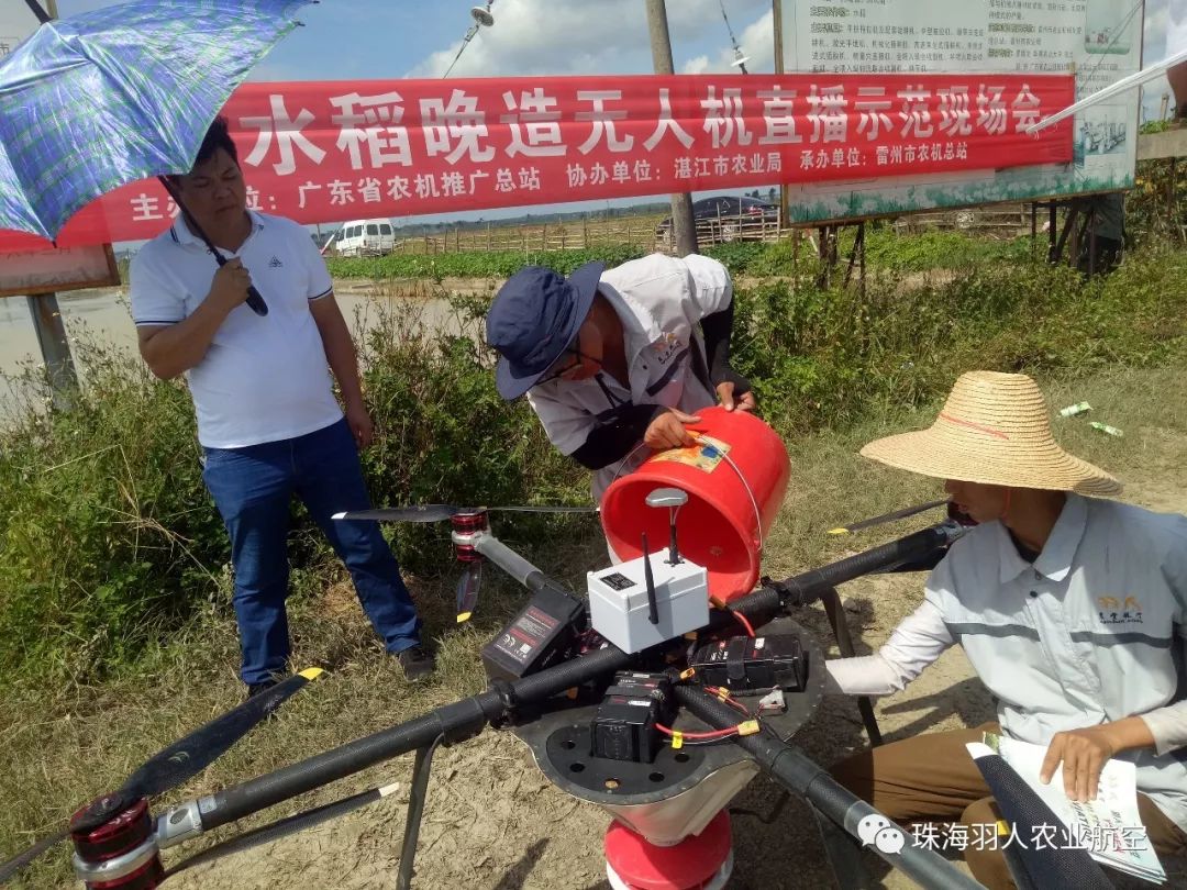正值晚稻播种大忙之际,羽人植保无人机沿自主规划航线运作,“肚子”源源不断地吐出一粒粒稻谷 —— 这是在雷州市南兴镇举办 “2018年水稻晚造无人机直播示范现场会”,探索在不改变水稻栽培方式直播的情况下,力争通过现代农机装备技术植保无人机技术替代人工,减轻劳动强度,提高工作效率,为雷州地区水稻直播寻找更好的替代方式。