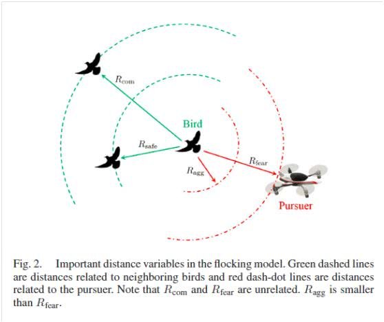 模型将鸟群视作一个整体,它们会统一改变或不改变路径。因此无人机与鸟群的距离非常重要,如果无人机过于靠近鸟群,它们就会分散开并单独飞行。