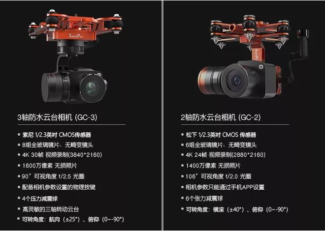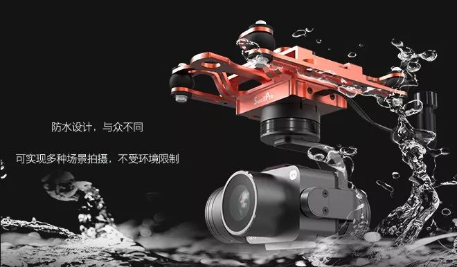 与普通的三轴云台相机不同,它具有特殊的防水设计,能防海水和淡水。可以实现雨天拍摄,水上水下拍摄等等。值得一提的是,相机外部玻璃镜片拥有特殊的防水涂层,当从水中起飞或在雨天飞行时,镜头同样能保持干燥,拍摄画面依然清晰可见。