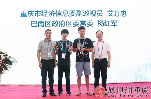 来自武汉的飞手柯梓鸣(右二)和来自日本的飞手铃木匠(左二)分别获得大赛的亚军、季军,重庆市经信委副巡视员艾万忠(右一)和巴南区政府区委常委杨红军(左一)为其颁奖