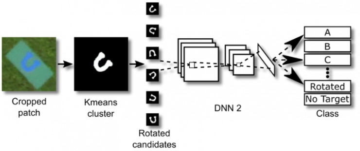 从全分辨率图像中裁剪出目标候选,并将其缩小成 32 x 32 像素的碎片,随后用卷积神经网络(CNN;见图 5)处理它们。我们精心的的设计了能够在轻量级计算的同时保持高精度的网络。除了组织者定义的形状分类外,我们还加入了一个「无目标」的分类来识别误报。被识别为「无目标」或者被分类到低可信度的部分将会被丢弃。在管道的这个节点上,绝大多数的误报都被消除了。