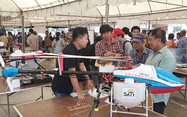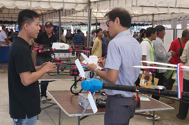 8月28日,泰国巴吞他尼府南律胶县举行了2018年水稻产业大会,周边农业合作社、种子公司、农机服务公司等参加了此次大会,大会上展示了各类大米新品种、种植新技术、植保新技术。天鹰兄弟植保无人机TY-M12、TY-D10和TY—787三款机型亮相大会,展示了高效的植保新技术,得到了参观者的热烈关注与欢迎。