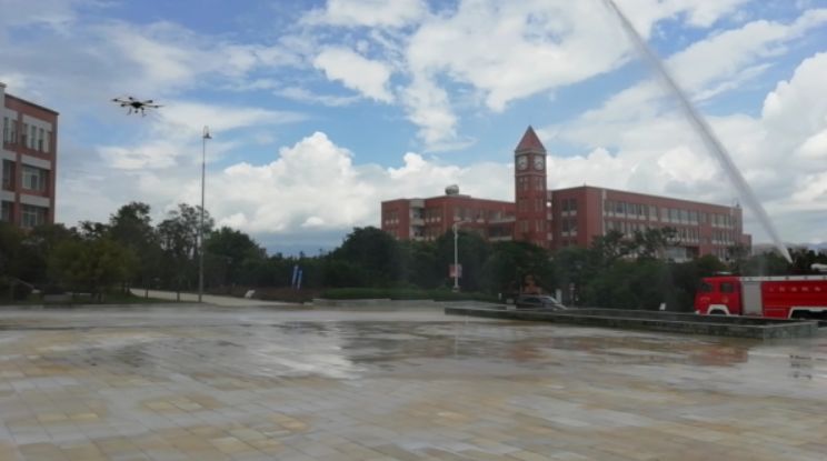 演练现场通过消防车喷水来达到强降雨的极端气候,海康威视雄鹰系列无人机飞入其中,保持机身稳定,展现出极高的环境适应性,完成演练。