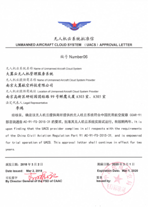 (中国民用航空局飞行标准司颁发的无人机云系统批准信)