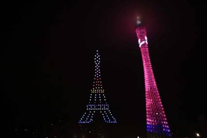 其实亿航与法国早有缘分。今年2月15日零点,既是传统新年又是情人节的浪漫夜,亿航就曾进行一场无人机灯光表演——珠江水面上,广州塔旁,“小蛮腰”广州塔与巴黎地标埃菲尔铁塔相遇,广州为法国送上烂漫的红玫瑰。