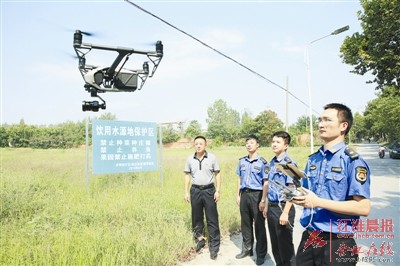 9月11日上午,庐阳经济开发区大房郢水库饮用水源地保护区内,几名城管队员正在通过“空中城管”——无人机对饮用水源地保护区进行航拍巡查,对该处违章建筑、卫生死角、垃圾偷倒等城市乱象进行“空中巡查”。