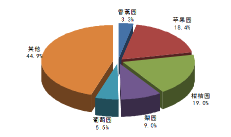 据国家统计局数据,从1993 年至今,果树种植面积和水果总产量一直稳居世界第一。到 2014 年,国内果树种植面积 1275 万公顷(合约 1.914 亿亩),其中几种主要的水果,香蕉园面积占比为 3.3% ;苹果园面积占比为 18.4% ;柑桔园面积占比为 19.0% ;梨园面积占比为 9.0% 。