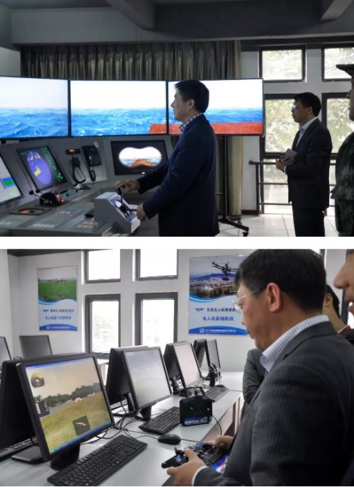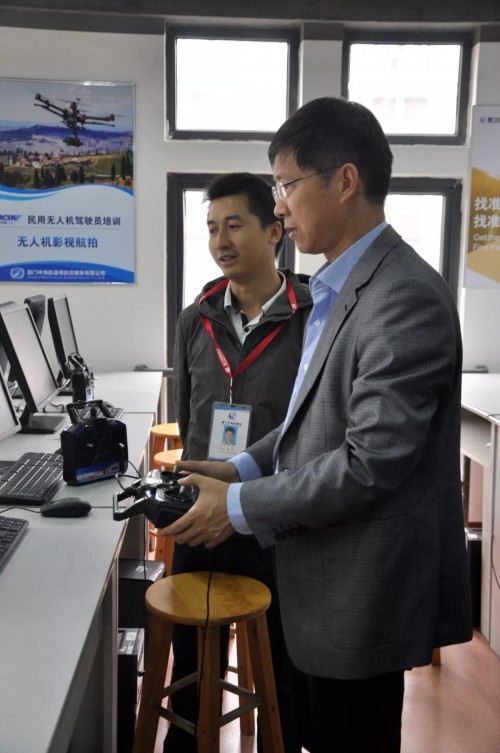 参观过程中,段校长一行对无人机专业的校企联合办学表现出浓厚兴趣。公司肖老师向学校领导作了生动理论讲解、精彩模拟操作以及真实演练。期间,段校长等人亲自动手无人机模拟操作,称赞说:“这样理论和实践紧密结合的教学安排,一定能够很大程度地激起学生的学习兴趣。”