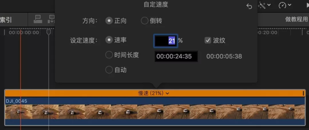 5. 由于拍摄的是 120 帧的素材,在 25 帧的时间线上播放,将素材速率降到 20.8% 左右,在这里降速到 21%(低于 20.8% 将会发生“掉帧”现象)。