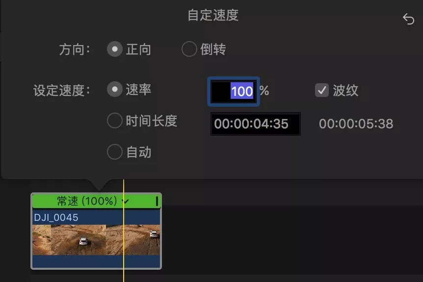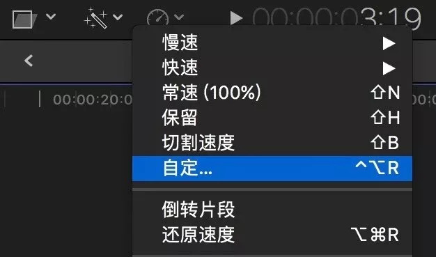 4. 点击这个仪表的小按钮,选择自定速度。(快捷键 Control+Option+R 也可以直接调出速度调整画面)