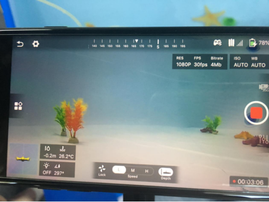 小编在实际上手的过程中,感受到许多的新奇玩法,它的一键定深模式可以让机器保持在同等深度前进或后退,也能够进行垂直上升或下降。整个机器的尺寸与重量都相对的轻便,整个机身一体感强烈,不愧是中船重工的设计师设计的船体,就像空中无人机的机身符合空气动力学一样,这款产品的外形也十分符合在水下的运动。