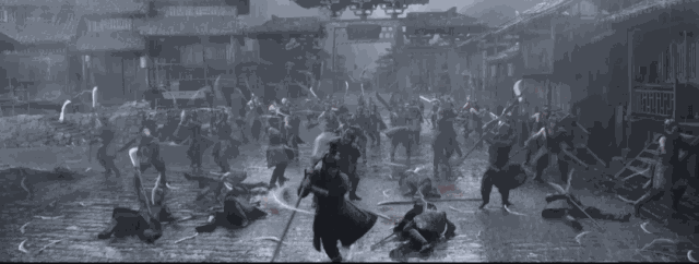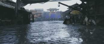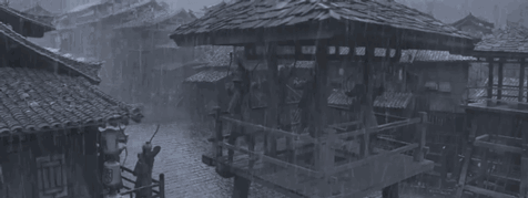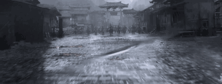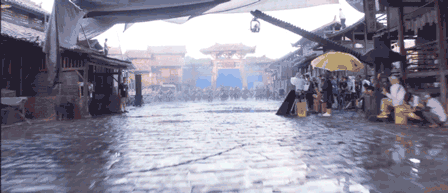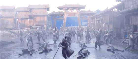 现场特效的雨很难大范围地平均控制雨量,一些不均匀的地方需要通过后期进行修补,后面需要擦除雨机以防穿帮,处理起来比较繁琐。所以攻城戏中除了一些体现人物和雨互动的中近景画面是实拍,大环境的雨只能通过后期进行制作,才能得到充沛均匀的雨量。