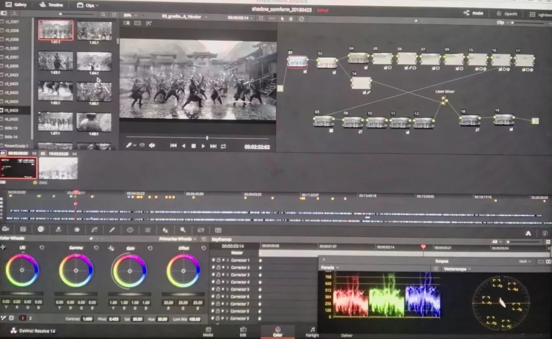 《影》的后期所用的剪辑工具版本为 Final Cut Pro 7,调色软件版本为Davinci Resolve Studio14.0,片尾滚屏字幕工具为Autodesk Flame。