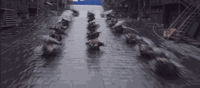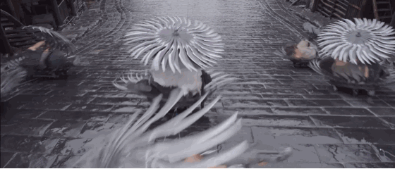 在伞刀士兵冲下斜坡的场景中,为了呈现出更有具视觉冲击力的画面,伞刀在旋转过程中需要有水花随之溅起的效果。而在拍摄中如果一直加水,地面就会变得非常滑,即使上方有群演拖拽住伞刀,也很难控制住力量,考虑到演员们的安全问题,最终路面还是没有加水,选择通过 CG 制作呈现效果。