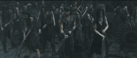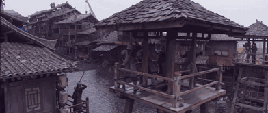 而在后期处理大环境中的伞刀士兵滑下斜坡的画面,他们保留了屋檐上弓箭手的部分,而远处除了露出人物面孔之外的伞刀其实都是通过后期 CG 制作的。