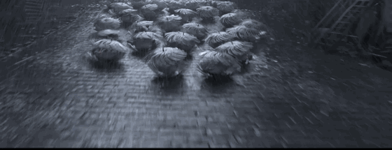 在这场戏的近景画面中,为了营造更具张力的画面,后期通过 CG 特效增加了伞刀的面积,让它看起来更加密集紧凑,还在伞面上增加了一些刀片。