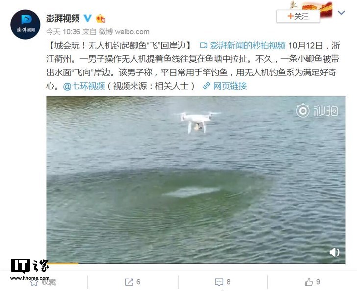 IT之家10月13日消息 无人机不仅可以用来拍照,还可以钓鱼!据澎湃新闻报道,10月12日,浙江衢州一男子就操作无人机成功在鱼塘里钓上鱼来。...