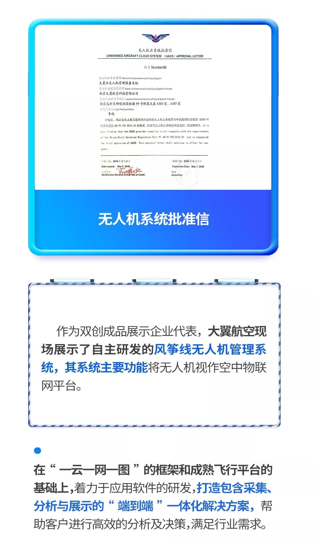 ⼤翼航空⾃主研发的⻛筝线™⽆⼈机云系统实现了⽆⼈机(Drone)、⻜⼿(Flyer)、成果(Result)、空域(Planning)四⼤要素的统⼀,是⾏业真正意义上的⽆⼈机⻜⾏资源计划(DFRP)系统。⼤翼航空是江苏省⾼新技术企业、双软企业,拥有多项软件著作权和专利证书,⻛筝线系统获得信息系统安全等级保护备案认证。⼤翼航空是江苏省消防救援总队应急通讯联动单位、江苏省遥感与地理信息学会科技服务站,⼤疆应急救援联盟⾸批成员、⼤疆创新⾏业应⽤授权服务商和系统集成商,与各地公安、消防、环保、城管、防汛抗旱等部门以及科研院校进⾏深度合作。除了商业活动,公司也积极履⾏企业社会责任,先后承担了消防救援、抗洪抢险、逃犯搜索、重⼤赛事活动直播等保障任务。