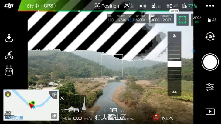 实际:误打开了相机的过曝提示。其实该功能对于普通消费级无人机来说,隐藏起来也无妨,绝大部分用户根本不明所以,误开了还认为是故障。