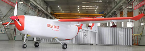 在今年618期间,京东自主研发的第一架大型货运无人机“京鸿”对外公开亮相。据京东官方公布的数据,该无人机目标有效载重量达到1-5吨,飞行距离超过1000公里。