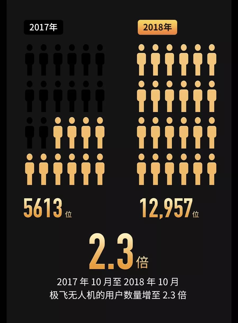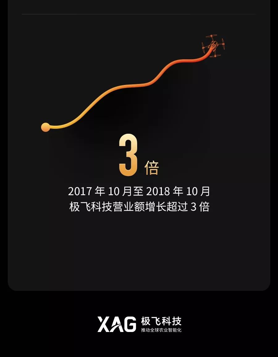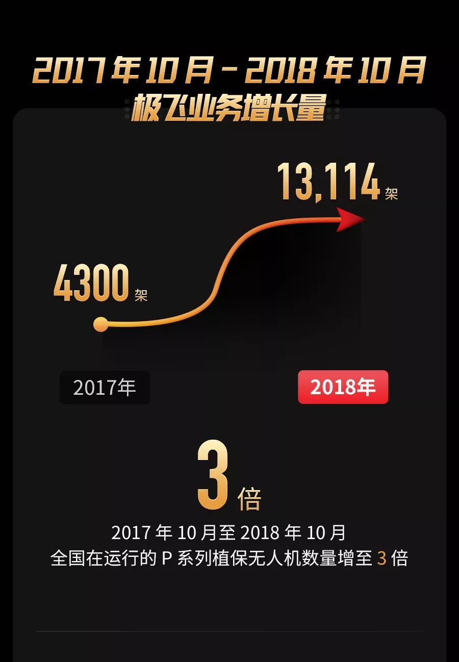 2017 年 10 月至 2018 年 10 月,全国在运行的 P 系列植保无人机数量从4,300 台增加至13,114 台,用户数量增加至12,957 位,作业面积也同比增长至400%。产品销售数量的3 倍增长,也为极飞带来了超过 3 倍的营收。