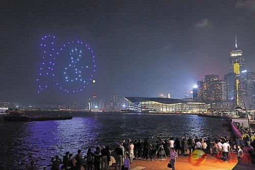 由100架无人机以灯光摆出数字“10”。图片来源:香港《文汇报》 记者 曾庆威/摄